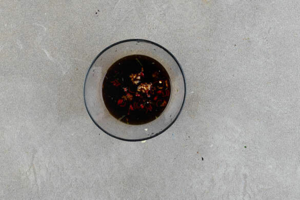 Den Knoblauch schälen und fein reiben. Die Chilischote halbieren und in feine Streifen schneiden. Die Limettenschale abreiben, dann die Limette halbieren und auspressen. Die Sojasauce gründlich mit dem Ketjap Manis, der Limettenschale und dem -saft sowie ½TL Zucker verrühren. Den Knoblauch und die Chilischote in die Sauce rühren.