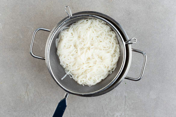 Die Nudeln in das kochende Wasser geben und gut umrühren. Den Topf vom Herd nehmen und die Nudeln ohne Hitzezufuhr ca. 8Min. ziehen lassen. In ein Sieb abgießen und kalt abschrecken.
