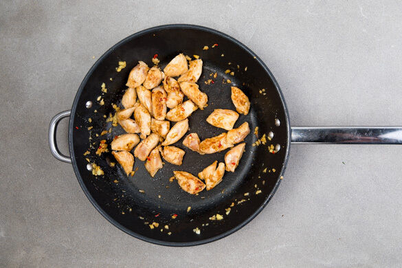 Das Fleisch in einer großen Pfanne oder einem Wok mit 2EL Pflanzenöl bei mittlerer Hitze 2–3Min. goldbraun anbraten. Auf einem Teller beiseitestellen, die Pfanne auswischen.