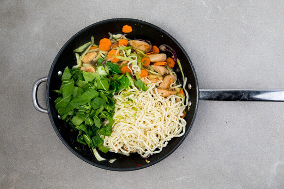 Du willst Asien auf die schnelle und leckere Art? Dann haben wir heute das ideale Gericht für dich! In Nullkommanix zauberst du würzig-aromatisches Hähnchen, verfeinert mit Ingwer, Teriyakisauce und Chili (nach Geschmack!), fein gebraten mit Pak Choi, Karotten und Zwiebeln und – ganz klassisch – breiten Nudeln. Als besonderes Extra gibt’s noch einen Hauch Limette. Da kann doch niemand widerstehen ...