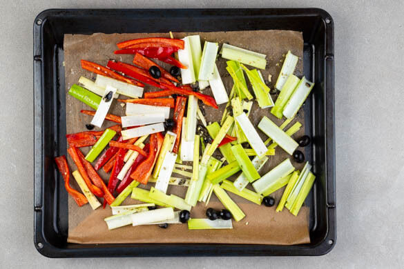 Den Lauch halbieren und in 3–4cm lange Streifen schneiden. Die Paprika vierteln, entkernen und in dünne Streifen schneiden. Den Lauch, die Paprika und die restlichen Oliven auf einem mit Backpapier ausgelegten Backblech verteilen und mit ca. ¾ des Dressings vermengen.