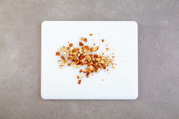 Die Mandeln grob hacken. Das Blech aus dem Ofen holen, das Fleisch vorsichtig vom Blech nehmen und beiseitelegen. Den Spinat mit dem Ofengemüse, den Croûtons und dem Bratensaft vermengen. Das Gemüse mit Salz, Pfeffer und ggf. mehr Essig abschmecken.