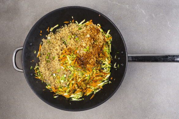 Die Zucchini mit einer Küchenreibe grob raspeln. Die Karotten ggf. schälen und ebenfalls grob reiben. Die Lauchzwiebeln in dünne Ringe schneiden.