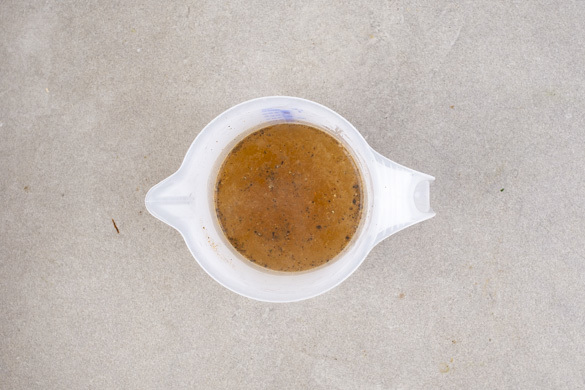 Die 1/2 des Brühgewürzes in 300ml heißem Wasser auflösen, dann die 1/2 der Gewürzmischung unterrühren und die Brühe mit Salz und Pfeffer abschmecken. Das Fleisch aus dem Kühlschrank nehmen und Raumtemperatur annehmen lassen.
