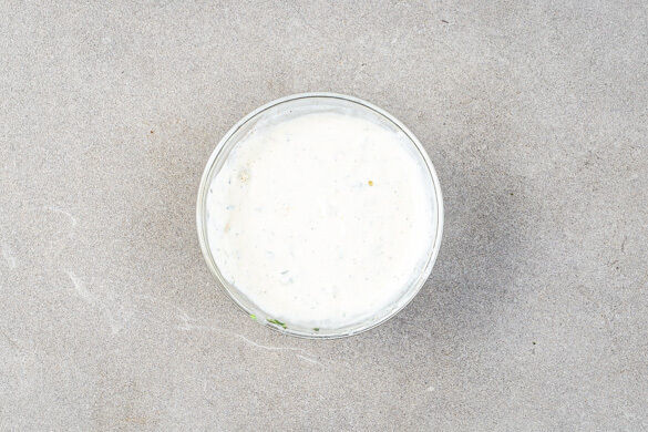 Die Crème fraîche mit der ½ des Knoblauchs, der ½ des Zitronensafts und dem Thymian verrühren. Die Creme mit Pfeffer abschmecken.
