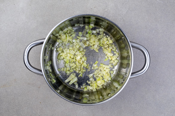 Die Zwiebeln in einem großen Topf mit 2EL Olivenöl bei mittlerer Hitze 2–3Min. glasig anbraten. Den Knoblauch hinzugeben und kurz mitbraten.