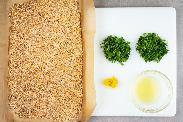 Die Quinoa in einer mittelgroßen Auflaufform mit der ½ des Knoblauchs, 1EL Olivenöl sowie je 1 Prise Salz und Pfeffer vermengen und ca. 10Min. im Ofen backen, bis die Quinoa leicht knusprig wird. Die Zitronenschale abreiben, dann die Zitrone halbieren und auspressen. Die Kräuter samt Stängeln grob schneiden.