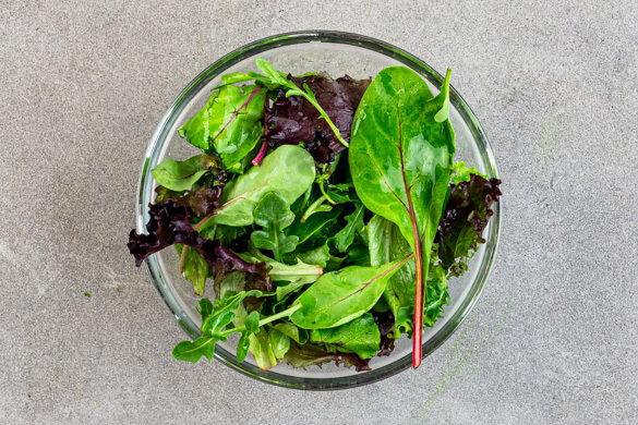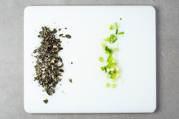 Die Kürbiskerne grob hacken. Die Lauchzwiebeln in feine Ringe schneiden.