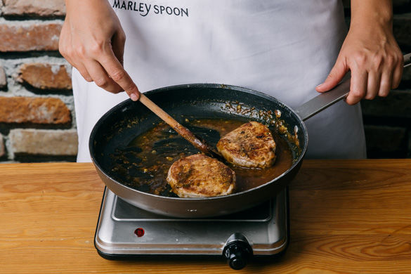 Das Fleisch mit 1EL Mehl und dem Bratengewürz bestäuben und mit dem Balsamicoessig und 100–150ml Brühe ablöschen. Die Sauce ca. 2–3Min. einkochen lassen.
