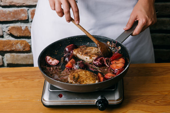 Die Zwiebeln und die Pflaumen zum Fleisch in die Pfanne geben und ca. 1–2Min. bei niedriger Hitze in der Sauce aufkochen lassen, mit Salz und Pfeffer abschmecken. Die Schweinesteaks in Pflaumensauce mit dem Ofengemüse servieren.