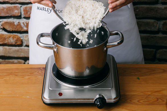 In einem mittelgroßen Topf 400ml leicht gesalzenes Wasser zum Kochen bringen. Den Reis in einem Sieb unter fließendem Wasser abspülen, bis das Wasser klar bleibt. Sobald das Wasser kocht, den Reis auf niedrigster Stufe abgedeckt ca. 12–18Min. kochen, bis das Wasser komplett aufgesogen und der Reis gar ist. Noch ca. 5Min. ohne Hitze abgedeckt ziehen lassen.