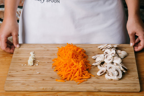 Währenddessen den Knoblauch schälen und fein hacken. Die Karotten schälen und mit einer Küchenreibe grob raspeln. Die Pilze ggf. mit einer Bürste oder etwas Küchenkrepp säubern und in dünne Scheiben schneiden.