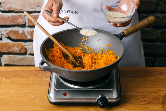 Die Karotten mit 1EL Pflanzenöl in einer großen, tiefen Pfanne oder einem Wok bei großer Hitze ca. 1–2Min. scharf anbraten, anschließend 1EL Sesam untermischen. Mit Salz und Pfeffer würzen, aus der Pfanne nehmen und warm stellen.