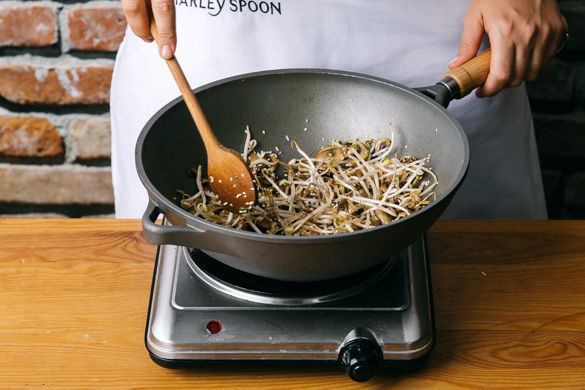 Dieses Traditionsgericht aus Korea wird noch ungemischt serviert. Dabei hat jeder Bestandteil – feiner Jasminreis, gebratene Karotten, Pilze, Spinat und Mungbohnensprossen, knuspriges Rinderhack und Sojabohnen-Chilipaste – seinen festen Platz in der Schale, bevor dann vor dem Essen alles durchgerührt wird. Du wirst begeistert sein!
