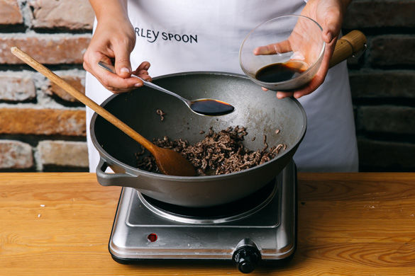 Das Hackfleisch mit 1EL Pflanzenöl bei hoher Hitze in der Pfanne oder dem Wok ca. 3–4Min. anbraten. Sobald das Fleisch gar ist, mit 1–2EL Sojasauce oder nach Geschmack ablöschen, aus der Pfanne nehmen und warm stellen.