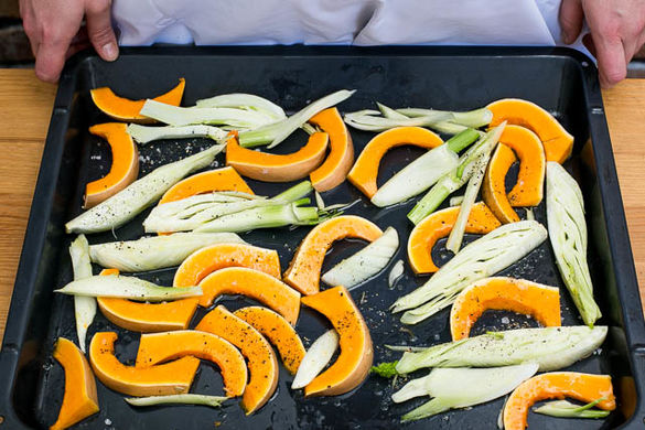 Den Backofen auf 250°C Ober-/Unterhitze vorheizen. Den Fenchel längs halbieren und in ca. 1,5cm breite Streifen schneiden. Den Kürbis längs halbieren, entkernen und in ca. 1cm breite Spalten schneiden. Das Gemüse auf einem mit Backpapier belegten Backblech verteilen, mit 1–2EL Olivenöl, Salz und Pfeffer mischen und 10–15Min. im Ofen rösten.