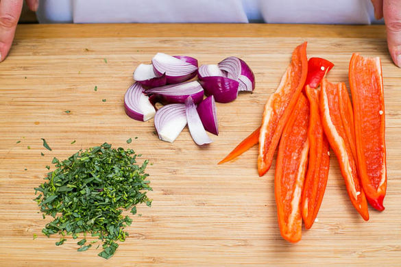 Währenddessen die Paprika längs halbieren, entkernen und nochmals längs halbieren. Die Zwiebel der Länge nach halbieren, schälen und in ca. 2cm dicke Spalten schneiden. Die Estragonblättchen von den Stängeln zupfen und fein hacken.