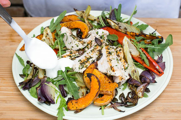 Mit im Ofen geröstetem Kürbis, Fenchel und Paprika harmoniert die gebratene Hähnchenbrust, die zuvor mit frischem Estragon mariniert wird, besonders fein. Noch einen Klecks Joghurt und etwas würzigen Rucola dazu und das Abendessen ist perfekt.
