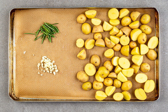 Den Backofen auf 240°C (220°C Umluft) vorheizen. Die Kartoffeln samt Schale je nach Größe halbieren oder vierteln und auf ein mit Backpapier ausgelegtes Backblech geben. Den Knoblauch schälen und grob schneiden. Die Rosmarinnadeln von den Stängeln streifen.