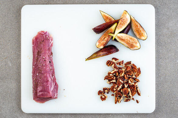 Die Pekannüsse in einer großen Pfanne ohne Zugabe von Fett bei mittlerer Hitze 1–2Min. goldbraun anrösten. Vorsicht, sie können schnell zu dunkel werden. Die Nüsse herausnehmen, grob hacken und die Pfanne aufbewahren. Die Feigen vierteln. Das Fleisch trocken tupfen und jeweils rundum mit je 1 kräftigen Prise Salz und Pfeffer würzen.