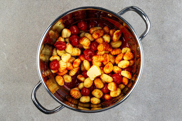 Die Zwiebelhälften aus der Sauce entfernen, dann die Gnocchi einrühren und bei mittlerer Hitze 3–4Min. kochen lassen, bis sie gar sind. Die Sauce mit 2EL Butter verfeinern und mit Salz und Pfeffer abschmecken.