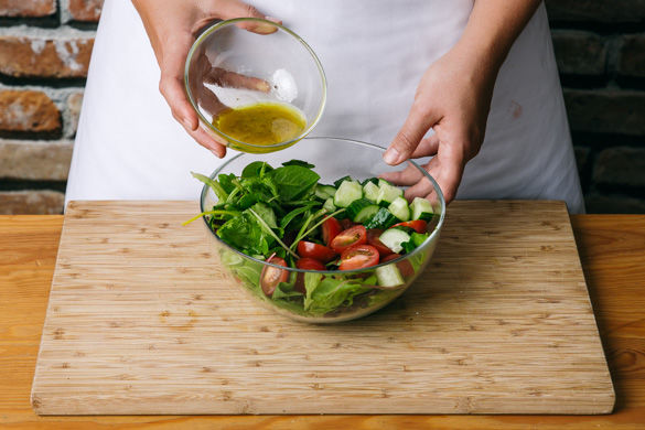In der Zwischenzeit die Kirschtomaten halbieren. Die Landgurke ggfs. schälen, längs vierteln und in Würfel schneiden. Wer mag, die Peperoni entkernen und in feine Ringe schneiden. Den Salat mit Kirschtomaten, Gurke und Lucy's Dressing mischen. Den Käse mit einem Sparschäler in Streifen schneiden.