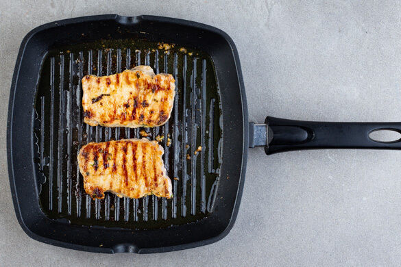 Das Fleisch aus der Marinade nehmen und trocken tupfen, mit 1EL Olivenöl einreiben und in einer Grillpfanne oder einer normalen Pfanne bei mittlerer Hitze auf jeder Seite 3–4Min. goldbraun anbraten. Mit je ½TL Salz und Pfeffer würzen.