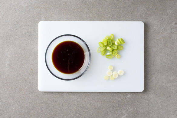 In einem mittelgroßen Topf ausreichend gesalzenes Wasser für die Nudeln zum Kochen bringen. Das Sesamöl mit 1TL Sambal Oelek verrühren und mit 1 Prise Salz würzen. Die Lauchzwiebel schräg in feine Ringe schneiden, den weißen und grünen Teil getrennt voneinander aufbewahren.
