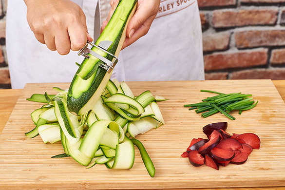 Inzwischen die Zucchini mit einem Sparschäler rundherum in Streifen abschälen. Den Schnittlauch dritteln. Die Pflaumen vierteln, entkernen und in Scheiben schneiden.