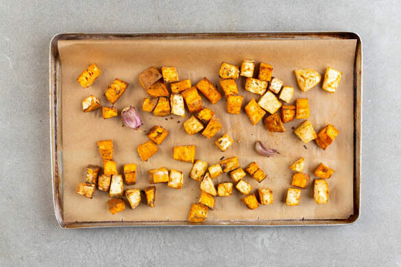 Den Backofen auf 220°C (200°C Umluft) vorheizen. Den Sellerie und die Süßkartoffeln ggf. schälen und in ca. 2cm große Stücke schneiden. Auf einem mit Backpapier ausgelegten Backblech mit der Gewürzmischung, 2EL Pflanzenöl, 1EL Mehl und ½TL Salz vermengen.