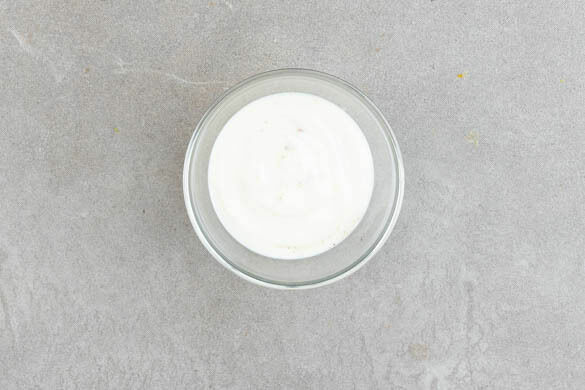 Den Joghurt mit je 1 kräftigen Prise Salz, Pfeffer und Zucker würzen. Den Knoblauch aus dem Ofen nehmen, aus der Schale drücken und mit dem Joghurt verrühren.
