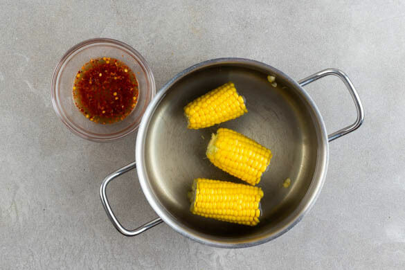 Den Backofen auf 250°C vorheizen, am besten mit Grillfunktion oder Umluft. In einem mittelgroßen Topf ausreichend gesalzenes Wasser für den Mais zum Kochen bringen. Die ½ der Chiliflocken in 1EL warmem Wasser einweichen. Den Mais schälen, von Härchen befreien und ggf. in kleinere Stücke schneiden. In das kochende Wasser geben und bei mittlerer Hitze in 12–16 Min. weich garen.