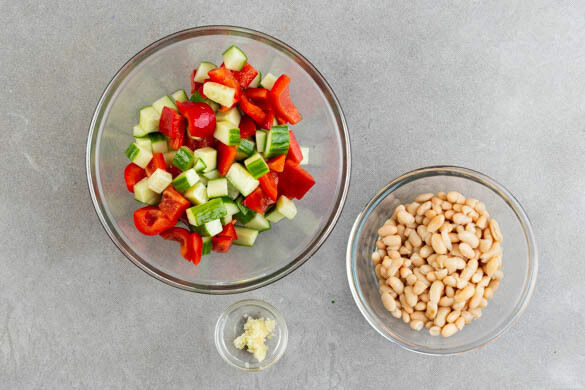 2EL Essig, 1TL Honig und ½TL Salz zu einem Dressing verrühren. Die Paprika vierteln, entkernen und mit der Gurke in ca. 1cm große Würfel schneiden. Die Gurken und die Paprika mit dem Dressing vermengen. Die Bohnen in einem Sieb mit kaltem Wasser abspülen und abtropfen lassen. Den Knoblauch schälen und sehr fein würfeln oder durch eine Knoblauchpresse drücken.