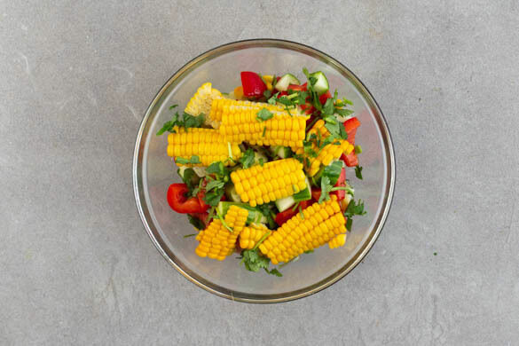 Den Mais mit einem scharfen Messer vom Kolben schneiden, dann mit dem geschnittenen Koriander unter den Salat mengen und mit 1 Prise Salz würzen. Den Salat nach Belieben mit den Korianderblättern garnieren und zur Bohnenpfanne servieren.