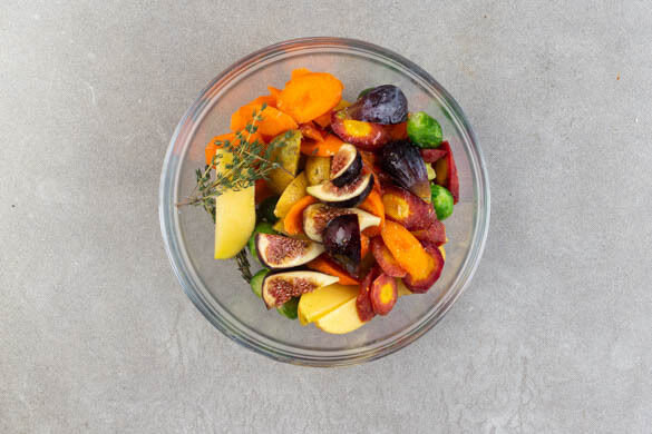 Die Kartoffeln samt Schale in ca. 2cm breite Spalten schneiden. Die Karotten ggf. schälen und schräg in dünne Scheiben schneiden. Die Feigen vierteln. Den Rosenkohl, die Kartoffeln, die Karotten und die Feigen mit ¾ des Thymians samt Stängeln, 2EL Olivenöl sowie je 1TL Salz und Pfeffer vermengen.