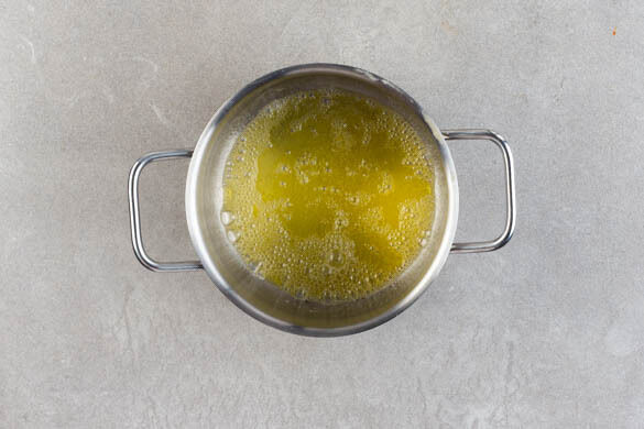 Den Knoblauch schälen und fein würfeln. Den restlichen Thymian von den Stängeln streifen und ebenfalls fein schneiden. Ca. 5Min. vor Ende der Backzeit 2EL Butter in einem kleinen Topf bei mittlerer Hitze schmelzen lassen.