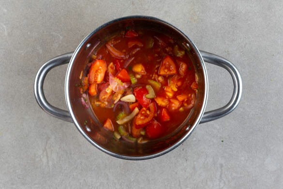 Den Sellerie, die Zwiebeln, den Knoblauch und die Petersilienstängel in einem zweiten mittelgroßen Topf mit 1EL Olivenöl und ½TL Salz bei mittlerer Hitze in 4–5Min. weich braten. Die Tomaten grob würfeln, mit der ½ des Tomatenmarks in den Topf geben und ca. 2Min. mitbraten.