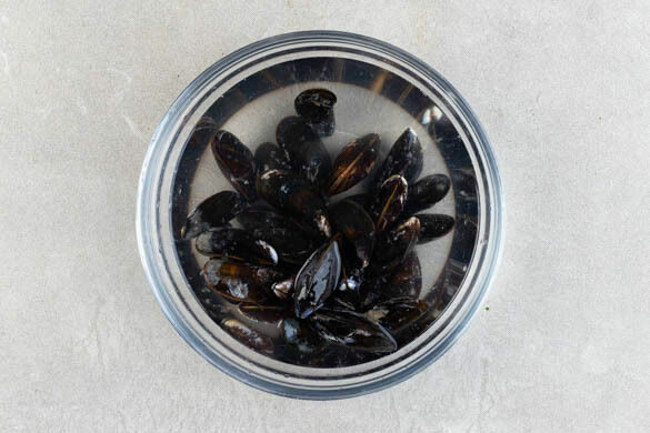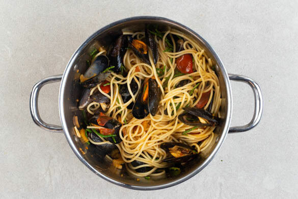Die Muscheln in einer großen Schüssel mit kaltem Wasser durchrühren, bis kein Sand mehr vorhanden ist. Tipp: Offene und beschädigte Muscheln, die beim Antippen nicht schließen, entfernen. Die Pasta in das kochende Wasser geben und in 8–10Min. bissfest kochen. In ein Sieb abgießen und abtropfen lassen.
