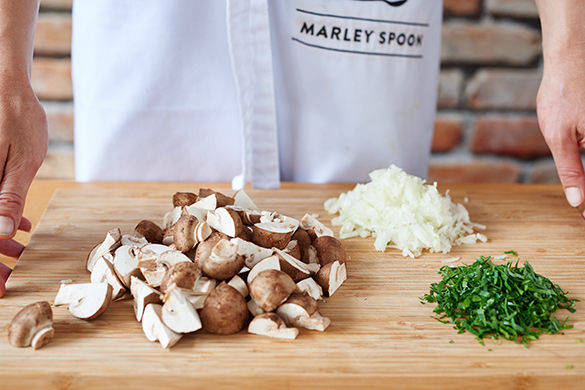 Inzwischen die Zwiebel schälen, halbieren und in feine Würfel schneiden. Die Champignons ggf. mit etwas Küchenkrepp oder einer Pilzbürste säubern und vierteln. Die Petersilie fein hacken.