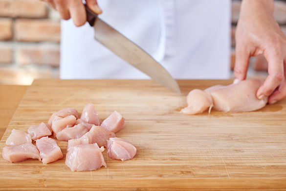 Das Fleisch mit etwas Küchenkrepp trocken tupfen und in ca. 2cm große Würfel schneiden.