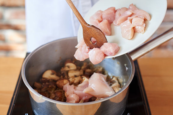 Die Crème fraîche in das Hähnchenragout einrühren und mit Salz und Pfeffer abschmecken. Erneut etwas einkochen lassen, bis die Sauce schön cremig ist.