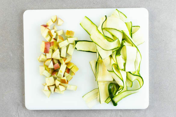 Inzwischen die Äpfel vierteln, entkernen und in kleine Würfel schneiden. Die Gurken mit einem Sparschäler rundum in breiten Streifen abschälen.