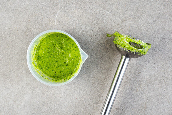 In einem Wasserkocher die notwendige Mindestmenge an Wasser aufkochen und die Cashews in einem hohen Gefäß mit 40ml kochendem Wasser übergießen. Den Knoblauch schälen und grob würfeln. Das Basilikum und die Petersilie samt Stängeln grob schneiden, dabei einige Petersilienblätter für die Garnitur beiseitelegen.