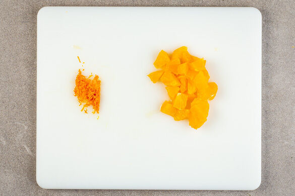 1TL Orangenschale fein abreiben, dann die Orange schälen und das Fruchtfleisch in mundgerechte Stücke schneiden.