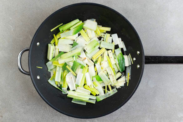Die Zwiebeln schälen, halbieren und in feine Streifen schneiden. Den Lauch jeweils längs halbieren, dann quer in ca. 3cm große Stücke schneiden.