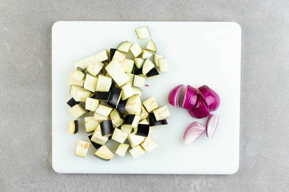 Die Zwiebel schälen, halbieren und in 6–8 Spalten schneiden. Die Auberginen in ca. 2cm große Würfel schneiden.