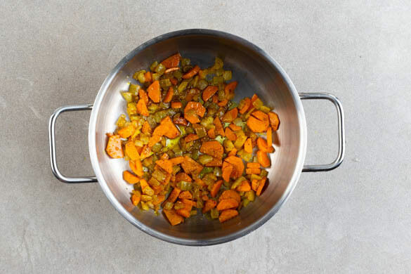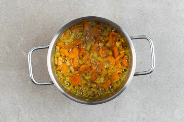 Sobald das Wasser kocht, den Reis hineingeben und abgedeckt bei niedrigster Hitze 18–20Min. kochen, bis das Wasser aufgesogen und der Reis gar ist. Noch ca. 5Min. ohne Hitzezufuhr ziehen lassen. Währenddessen die Karotten und die Zwiebeln in einem mittleren Topf mit 1EL Pflanzenöl bei mittlerer Hitze in 5–7Min. weich anbraten.
