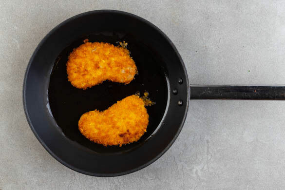 Die Schnitzel in einer mittelgroßen Pfanne mit 1EL Pflanzenöl bei mittlerer bis starker Hitze in 4–6Min. von beiden Seiten goldbraun und knusprig braten. Aus der Pfanne nehmen und kurz abkühlen lassen, dann in ca. 1,5cm breite Streifen schneiden.