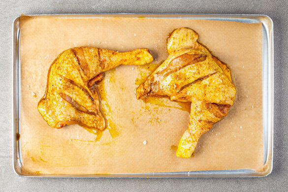 Den Backofen auf 250°C (230°C Umluft) vorheizen. Die ½ des Currypulvers mit 1EL Pflanzenöl und 1 kräftigen Prise Salz verrühren. Die Hähnchenschenkel trocken tupfen, 2–3-mal bis zu den Knochen einschneiden und mit dem Würzöl einreiben. Auf einem mit Backpapier ausgelegten Backblech 35–50Min. auf der untersten Schiene backen. Ggf. mit Alufolie abdecken, falls die Haut zu dunkel wird.
