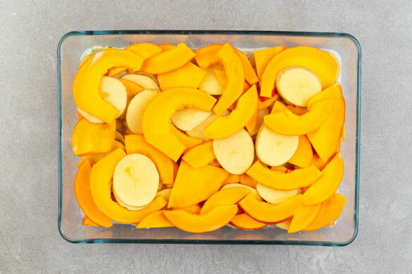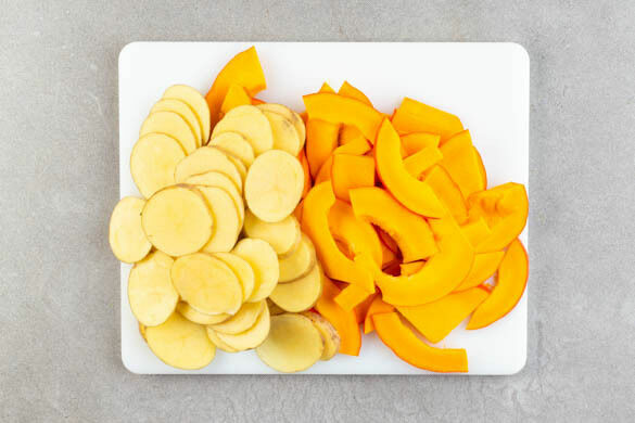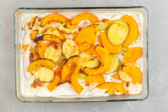 Den Kürbis halbieren, die Kerne mit einem Löffel herausschaben und die Kürbishälften samt Schale in möglichst dünne Scheiben schneiden, z. B. mit einer Mandoline oder einer Küchenmaschine. Die Kartoffeln samt Schale in genauso dünne Scheiben schneiden.
